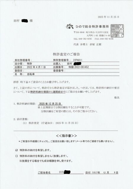 2025年12月15日 [両輪軸固定輪行].特許査定通りました。 先週Instagram.facebook.上upしましたが、こちらのライブドアブログへupいたします。先ほど特許事務所より連絡入り.[両輪軸固定輪行].特許査定通りました。出願から3年10ヵ月.おそらく拒絶査定来るだろうと見込んでましたが、一発で特許取得の運びとなりました。 特許取得後の運用難しいのは承知しております.これに驕ることなく常に新しいアイディアを.自転車へ還元する努力してまいります。 [ひので総合特許事務所][Byob factory tokyo]の皆様ありがとうございました。#ひので総合特許事務所#tcw03#sunrisecycles#bakansucycles#byobfactory#cocreation#戸田橋cycleworks#2026ジャパンバイクテクニーク#2022ジャパンバイクテクニーク#2025ハンドメイドバイシクル展#輪行#両輪軸固定輪行
